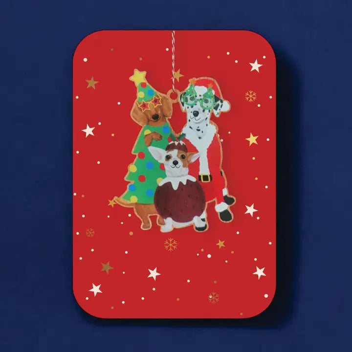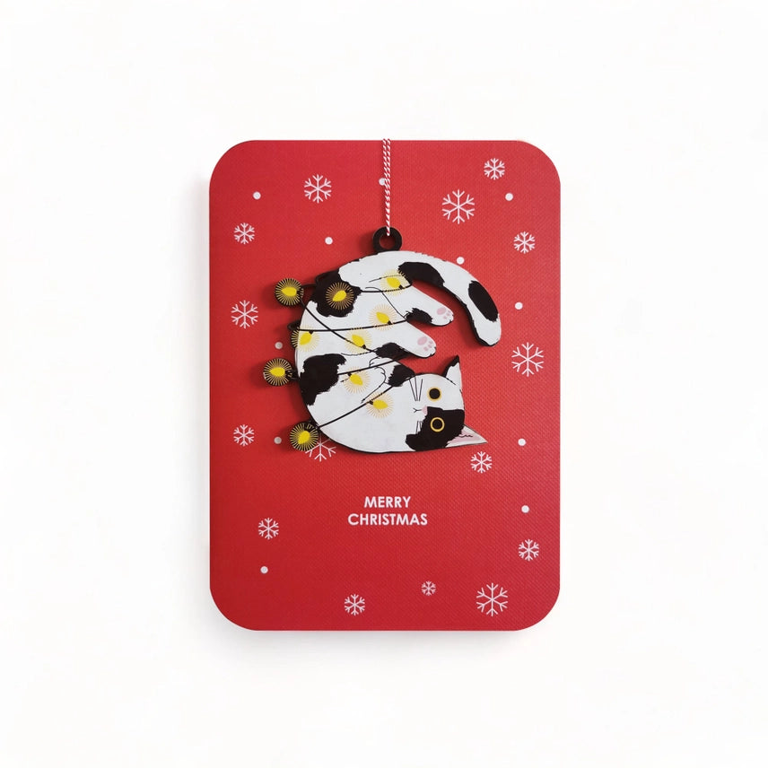 Gli ornamenti in legno sono stampati su materiali sostenibili ed ecologici. Gli ornamenti sono facilmente rimovibili dalla carta, rendendoli perfetti per essere appesi agli alberi di Natale come decorazione festiva. Il design è giocoso e affascinante, con una varietà di simboli e immagini natalizie. Queste carte sono un regalo unico e premuroso. L'interno è vuoto per il tuo messaggio personale.