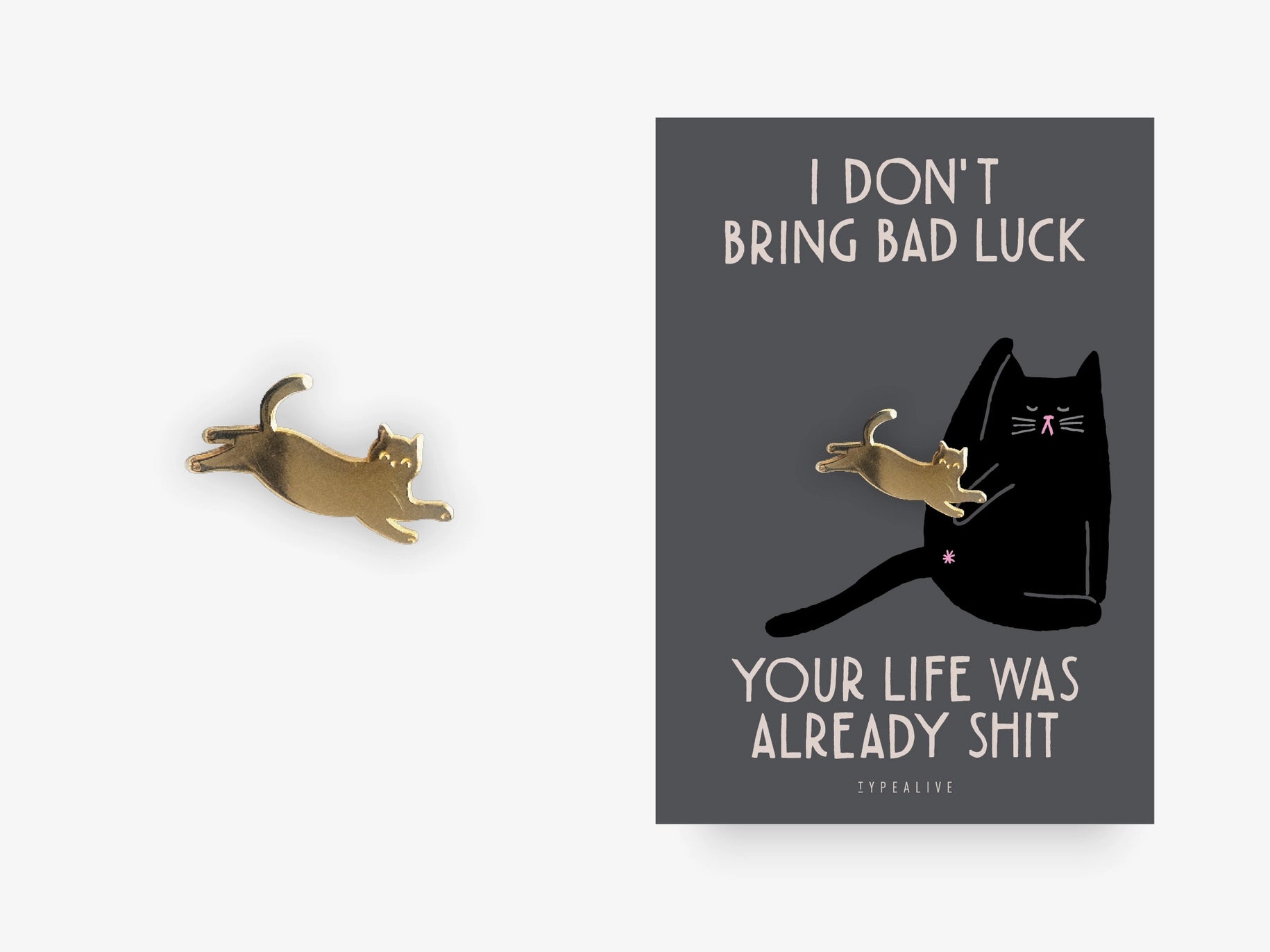 In ottone smaltato placcato oro, ed accompagnata da una bellissima cartolina dal design originale, ogni spilla è unica perchè fatta a mano. Un regalo perfetto, dall'umorismo raffinato e con un piccolo prezzo accessibile a tutti!